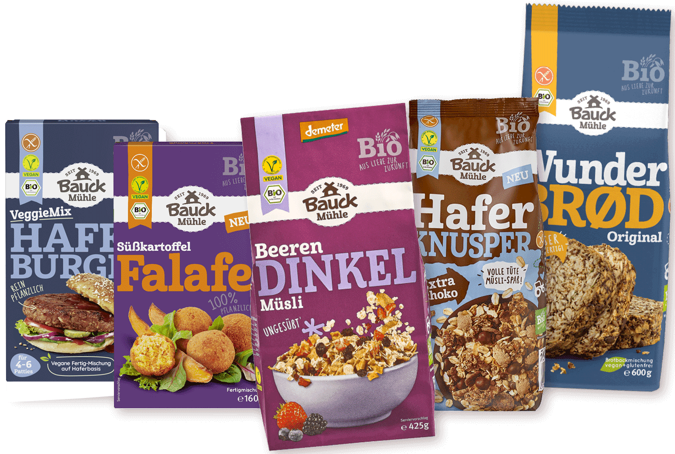Müslis, Mehle, Backmischungen für Torten, Kuchen und Brote, Porridges und Veggie-Mischungen, alles meist glutenfrei, weizenfrei und vegan – unter der Marke Bauck Mühle vertreibt die Bauck GmbH rund 160 leckere Produkte. Immer nach dem Motto: „Bio. Aus Liebe zur Zukunft.“