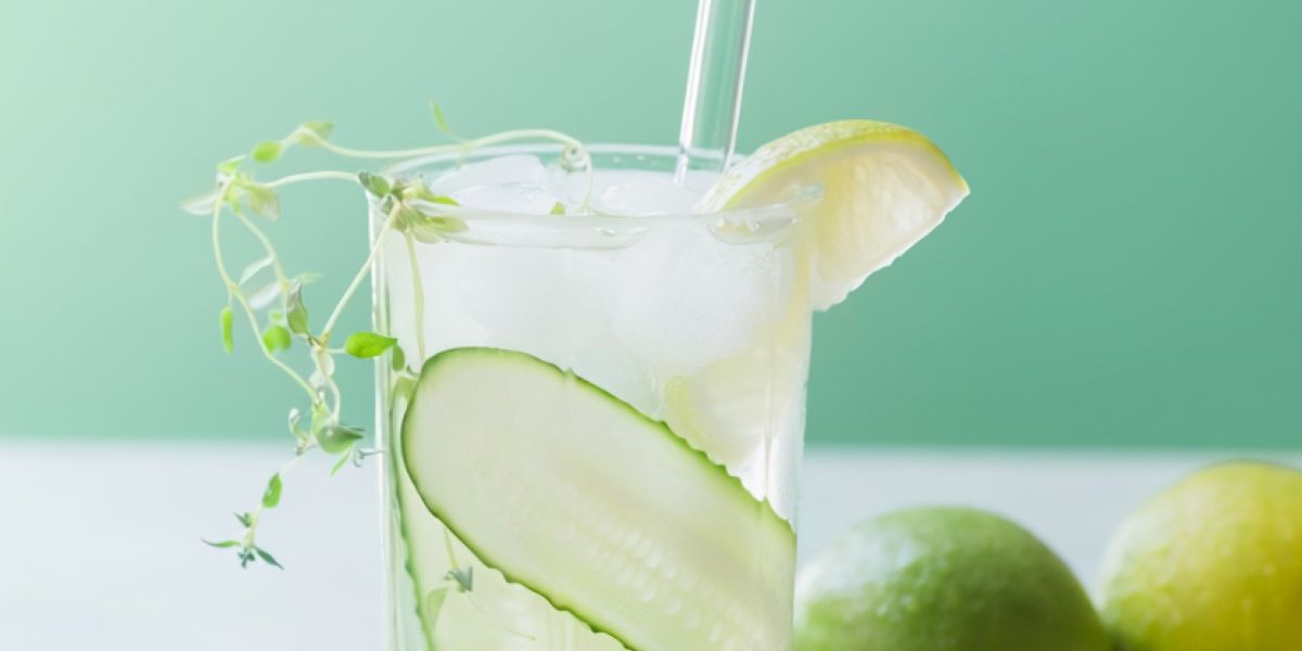 3. In ein Glas abseihen und Gurkenscheiben hinzufügen.
